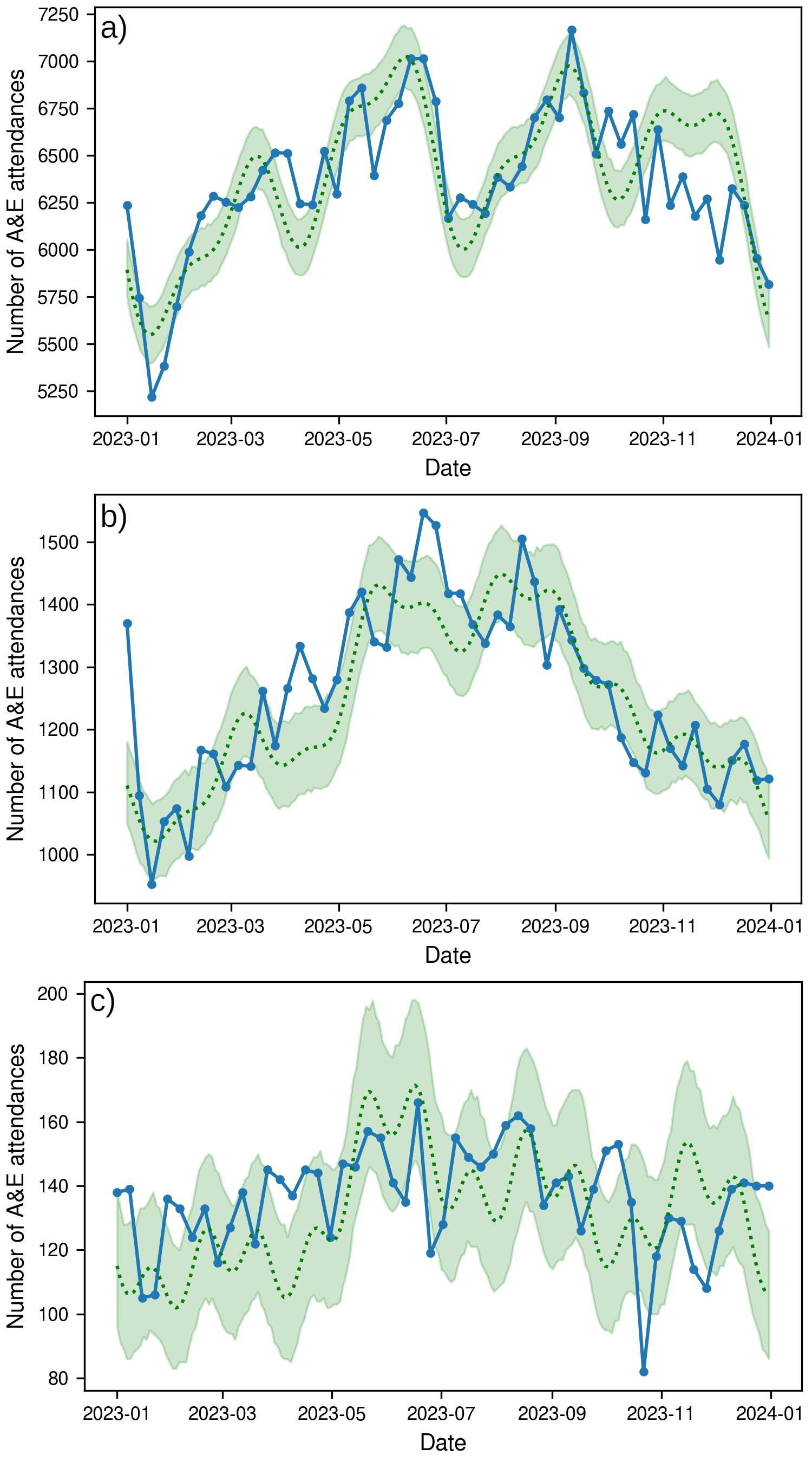 This post documents a small project I worked on from January through April 2024 with Keren Tapper, Ross Walker, and Toyo Sadare, on behalf of Public Health Scotland. Our brief was to forecast the number of patients likely to turn up at Accident & Emergency centres across Scotland, using just the data that the Scottish government make publicly available. The largest hurdle we encountered was the extreme variation in the number of people served by a given hospital in Scotland. This means noise, or week-to-week variation in the number of patients who attend A&E is much more significant in, say, Orkney than Glasgow. Ultimately, this was a fun opportunity to cook-up different approaches to modelling this particular time-series, that were not wholly unsuccesful, though I now realise there are more standard ways to tackle this kind of problem.